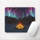 Em um vale coberto de neve em uma noite gelada no morto do inverno uma fogueira salta para cima para espelhar as luzes do norte enchendo o céu acima das montanhas distantes.