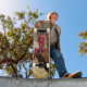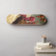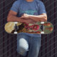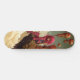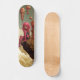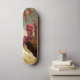 Skateboard illustration of a pink-haired girl is sitting on the edge of an old, rusty floating island in space with many clouds and houses hanging from it. She is wearing a blue bodysuit with red details and shoes. The sky above her head has many flying lanterns. The art is in the style of digital art.