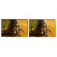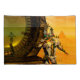 Imagem de ficção artística e brilhante em cores amarela, verde, castanha, branca. Titan cyborg da Hyperion com sua vibrante carapaça metálica cromada refletiva em um ambiente surreal com pirâmides, sol quente, deserto semelhante a uma paisagem egípcia, quadro de animação do filme 3D Hyperion World .Baldesign3d (c)