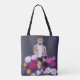 Personalize ou remova facilmente o texto desta adorável bolsa de tote que contém um jardineiro de flores místico perdido nas suas dálias. Ele está vestido com tons de marrom, ouro, branco e bronzeado e estiva um chapéu para sombra, barba e bigode. As flores são magenta, cor-de-rosa, amarela, lavanda e roxa e formam um padrão abstrato girando ao seu redor. O texto, que é uma citação de Ralph Waldo Emerson, diz: A Terra ri em flores. Maravilhoso para o Dia da Terra ou qualquer vez que você quiser Pense verde.