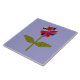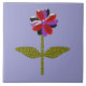Este incrível azulejo apresenta uma imagem digital de uma margarida com um tronco verde com duas folhas verdes sobre ela e pétalas roxas, vermelhas e pretas coloridas com um centro roxo. As pétalas parecem feitas de plástico brilhante que pegou a luz e causou um efeito iridescente. O fundo é uma cor azul calmante.