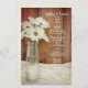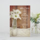 Personalize o Menu de Casamento de Barn de Garrafas Brancas Rústicas no Menu de Casamento da Garrafa de Leite com os detalhes da refeição que você servirá no almoço de chá de panela, poste o brunch de casamento ou o janto de fazenda de recepção de casamentos adicionando a salada ou o primeiro curso, a entrada ou o segundo curso e a sobremesa ou o terceiro curso. Personalize-o com os nomes da noiva e noiva, local de evento e data. Este charmoso menu de casamento de festa de celeiro personalizado apresenta uma fotografia floral acinzentada de uma garrafa de leite de vidro vintage cheia de margaridas brancas e uma base branca de cetim e madeira marrom.