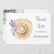 Obrigado por ser minha dama de honra cartão. Este design apresenta uma ilustração de aquarela de flores de lavanda sobre um chapéu de palha. No verso - folhagem de eucalipto e flores de lavanda roxa.