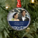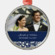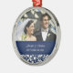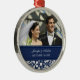 Ornamento customizável do casamento da foto em azuis marinhos escuros elegantes e modernos e creme fora da cor damasco floral clássica branca. Aperfeiçoe como uma lembrança do Natal para recordar seu dia especial ou para comemorar seu primeiro Natal ou como favores wedding personalizados.
