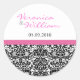 Um padrão de wallpaper damask preto-e-branco junto com um sotaque de regra cor-de-rosa nesse adesivo. Personalize-o facilmente com o(s) seu(s) nome(s), data do evento ou substitua qualquer informação. Disponível em cores alternativas com produtos correspondentes.