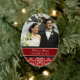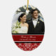 O ornamento da foto do casamento no inverno customizável com sua própria foto do casamento e o casamento datam no vermelho elegante, preto e branco com cor damasco floral clássica. Um presente à moda do Natal para a família e os amigos ou para decorar sua árvore ou casa de Natal para os feriados. A maneira perfeita de recordar seu dia de casamento no inverno.