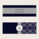 Uma imagem digital uniforme de cinza prateada e marinho azul-damask no topo, marinho antigo e faixas de estilo de satin azul-meia-noite no fundo, com uma camada de fita com um selo de texto monograma personalizável.