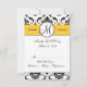Cartão de resposta para convite de casamento em preto e branco vintage com sotaque na cor amarela que você pode personalizar. Um belo padrão damasco ao fundo é acentuado com um adorno circular e monograma sobre uma linha amarela contendo os nomes dos noivos. Efeitos do Photoshop com sombras dão a este cartão um visual 3D em camadas impresso diretamente no papel de sua escolha. Design do cartão de resposta de casamento por Elke Clarke ©2010, 2012. Gráficos licenciados. Uma maneira elegante de definir o tema do seu casamento. Personalize com os detalhes do seu casamento e as informações do cartão de resposta para ter a coleção perfeita de convites de casamento.