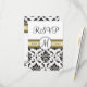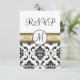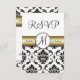 Convite de casamento sofisticado e elegante em preto e branco com cartões de resposta RSVP com sotaque dourado que você pode personalizar. Um belo padrão damasco ao fundo é acentuado com um adorno circular e monograma sobre uma linha com efeito metálico dourado contendo os nomes dos noivos. Efeitos do Photoshop com sombras dão a este cartão um visual 3D em camadas impresso diretamente no papel de sua escolha. Design do cartão de resposta de casamento por Elke Clarke ©2010, 2012. Gráficos licenciados. Uma maneira elegante de definir o tema do seu casamento. Personalize com os detalhes do seu casamento e informações do cartão de resposta para a coleção perfeita de convites de casamento.