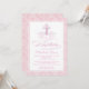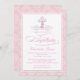 Meninas, damascos cor-de-rosa, convidam baptismo com cruz cor-de-rosa e roteiro elegante num bonito fundo de damascos cor-de-rosa. Este elegante convite para batismo de damascos cor-de-rosa é facilmente personalizado para o seu evento simplesmente adicionando os seus detalhes no estilo de letra e cor, e a redação da sua escolha.