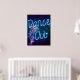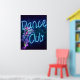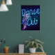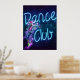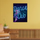 As palavras "Dance Club" em luzes de neon com uma dançarina de rua. O fundo é uma parede de tijolos.