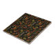 Sophisticated mid-century geometric pattern ceramic tile featuring layered circles, arches, triangles, and rectangles in forest green, burnt orange, ochre, and cream on a black background. Rich textures and retro-modern shapes create a bold design ideal for Bauhaus lovers, vintage décor fans, and anyone drawn to moody modern style.