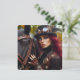 Um espantoso cavaleiro vitoriano-vitoriano cavaleiro escuro, com olhos azuis piercing, cabelos vermelhos, óculos e chapéu de topo, fica alto ao lado de seu magnífico cavalo preto em roupas de couro com engrenagens de relógio em um reino histórico steampunk.