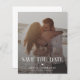 Simples e elegante noivado de fotos com dupla face dupla destino informal BUDGET BARATO casamento salve a modelo do cartão de data na tipografia neutra a preto e branco. Adequado para casamentos modernos.