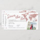 Casamento de Destino de Mauve Dourada e Profunda da Tendy Salve o Cartão de Data que parece um Cartão de Embarque ou Bilhete de Avião com espaço para duas fotos de seus viagens juntos.