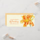 Cores d'água detalhados de uma lindíssima flor Hemerocallis neste bonito convite de casamento floral, cor de laranja e amarelo. Capturadas para o dia como essas flores tendem a durar no máximo 24 horas, então uma flor muito apropriada para o seu único dia especial de casamento. Convite para casamento cor de laranja Hemerocallis, design adaptado da pintura original de aquarela por Sarah Trett.