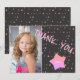 Um cartões de agradecimentos de aniversário bonito para seus amigos e família. Carregue sua foto e personalize o cartão com seu nome. Este cartões de agradecimentos de menina tem um padrão de estrelas colorido na frente e no verso. O nome está no meio de uma grande estrela rosa. Excelente como cartões de agradecimentos para garotas.