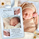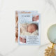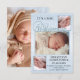 Cartão de anúncio de nascimento elegante com espaço para 4 fotos de seu próprio bebê e família, enquadradas por um layout azul moderno de burlap. O texto de boas-vindas é um arquivo separado e pode ser excluído se você não precisar dele. O verso inteiro mostra sua própria foto ou você pode escolher uma cor personalizada.