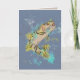 Envie algo especialmente especial com esta ilustração desenhada à mão da colorida truta arco-íris em aquarela num cartão em branco azul de nuvem de tempestade com pequenas moscas de pesca dentro.