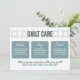 Uma colcha é um trabalho de amor, e muitas vezes se torna uma herança familiar. Quando você oferecer uma colcha, use esta carta para ajudar o receptor a aprender a cuidar da sua nova colcha precioso! As listas melhoram quando são amadas, e este cartão encorajará o seu destinatário a usá-lo. A frente do cartão diz como lavar, secar e armazenar sua nova colcha. A parte de trás da carta tem espaço para o fabricante escrever informações importantes sobre a colcha: por quem ela é feita, onde ela é feita, quando foi feita, com que padrão ela foi feita, colagem de detalhes e detalhes materiais.