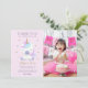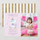 Cartões de agradecimentos de festa de aniversário de tema de unicórnio mágico. Obrigado os hóspedes para celebrar o dia especial do seu filho! Adicione sua própria foto de aniversário do seu filho. Projetado com rosa e ouro. Os textos são facilmente editáveis on-line. Ilustração e design do Namibear Art Studio. ©Namibear