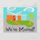 Este cartão postal de alteração de endereço personalizável de Meio século terá a certeza de que pretende colocar o tapete WELCOME e de que se vai tornar em casa! A design de arte minimalista da década de 1960 apresenta uma elegante pedra laranja e uma casa de vidro aqua numa relva luxuosa, verde, em forma de bumerangue. O gramado forma um oásis no meio de suas cinzas, arredores de concreto. Uma palmeira verde está balançando na brisa. Quatro, pedras laranja pisadas levam o caminho para a porta traseira, vermelha, frontal com três vidraças retangulares de vidro. À esquerda da porta, uma floreira de turquesa segura uma planta verde tropical. A casa tem um telhado branco inclinado em V que aponta em direção a duas nuvens brancas em forma de rim. O céu é uma forma serena de aqua. A frente deste cartão diz, "Nós nos movemos!" Personalize o lado oposto com suas novas informações de contato. Ninguém vai querer jogar pedras desta design de casa de vidro moderna! Comprar este produto da era espacial e seja o gato mais legal do seu quarteirão!