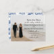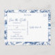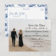 Procurando uma maneira elegante de anunciar o seu casamento? Este cartão-postal personalizável de "salve o data" permite que você faça o upload da sua foto de noivado favorita, mantendo o design sofisticado e moderno. Com uma disposição de tipos elegante que combina com roupas escuras e ambientes de praia, o verso apresenta um padrão azul atemporal de chinoiserie para um acabamento clássico. Perfeito para casamentos na praia, casais modernos ou qualquer pessoa que queira um toque refinado e pessoal.