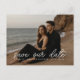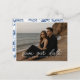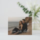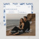 Procurando uma maneira elegante de anunciar seu casamento? Este cartão-postal personalizável de "save-the-date" permite que você faça o upload da sua foto de noivado favorita, mantendo o design sofisticado e moderno. Com uma tipografia elegante que combina com roupas mais escuras e ambientes de praia, o verso apresenta um padrão azul atemporal de chinoiserie para um acabamento clássico. Perfeito para casamentos na praia, casais modernos ou qualquer pessoa que queira um toque refinado e pessoal.