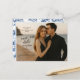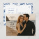 Procurando uma maneira elegante de anunciar o seu casamento? Este cartão-postal personalizável de "salve a data" permite que você faça o upload da sua foto de noivado favorita, mantendo o design sofisticado e moderno. Com uma colocação de tipos elegante que combina com roupas escuras e ambientes de praia, o verso apresenta um padrão azul atemporal de chinoiserie para um acabamento clássico. Perfeito para casamentos na costa, casais modernos ou qualquer pessoa que queira um toque refinado e pessoal.