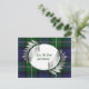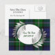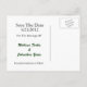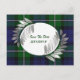 Elegante cartão postal de save the date de casamento feito no tradicional xadrez verde e azul Forbes. Lindos gráficos de frondes de feto em tom prateado enquadram uma área de texto branca redonda, na frente. Todo o texto, na frente e no verso do cartão, é totalmente personalizável para ler o que você quiser.