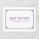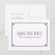 Cartão postal simples e minimalista de Save the Date Deco Chic com uma moderna moldura ornamental art déco roxa. Este cartão postal clássico e elegante é fácil de personalizar com os detalhes do seu casamento. Encontre mais opções de personalização clicando em Personalizar.