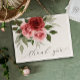Este design de cartões de agradecimentos de casamento inspirado na vintage apresenta rosas de aquarela impressionantes em tons de vermelho e rosa, aliados a folhagem verde mutada. A paleta de cores suave e neutra complementa casamentos de todas as estações, especialmente para casamentos outono. Ideal para casais que buscam um eterno, romântico e elegante para expressar sua gratidão.