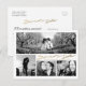 Personalize este moderno cartão-postal de casamento "Save our Date" com texto manuscrito em falso dourado sobre fundo branco. Substitua as quatro imagens do modelo com suas 4 fotos favoritas. Uma das imagens é uma foto panorâmica horizontal ampla e as outras três são menores. Para melhores resultados, use fotos de alta resolução. Além disso, altere todas as informações do modelo em ambos os lados com as suas. Este design tem a seguinte frase: "Estamos nos casando! (Com a data do casamento) E gostaríamos que você guardasse a data para poder compartilhar nosso dia especial. Convite formal a seguir." Você pode alterar as palavras com as suas. Por favor, note que o dourado é uma impressão colorida (amarelo) e não é realmente uma cor metálica dourada ou folha de ouro.