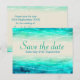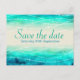 Salve a data dos espumantes de casamento pintados em um efeito azul e verde de turquesa azul-turquesa com uma onda gráfica sobre fundo arenoso. O casamento original salvou o cartão postal. Perfeito para um casamento de praia, costeira ou de destino tropical. Parte do jogo de casamento espumante. Uma elegante design exclusiva de Sarah Trett.
