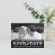 Personalize este cartão postal de foto moderno e elegante com o texto "Save the Date" (salve a data) com brilho prateado falso, o que significa que o brilho é apenas uma impressão colorida e não é realmente brilho prateado. No verso, há uma redação "Estamos nos casando! E gostaríamos que você salvasse a data (data aqui) para poder compartilhar em nosso dia especial! Convite formal a seguir." Você também pode alterar essa redação com suas próprias palavras. Este design de cartão postal é perfeito para uma imagem horizontal. Altere todas as informações e a imagem do modelo com as suas. Perfeito especialmente para imagem horizontal em preto e branco.