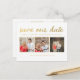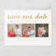 Linda tipografia com lâmina de ouro falso na frente deste cartão-postal de designer que você pode personalizar com 3 retratos fotográficos de seu noivado/casamento. Personalize fácil e rapidamente este cartão-postal de designer, impresso profissionalmente, aqui e agora, simplesmente digitando sobre o texto de exemplo e adicionando suas próprias fotografias. Tipografia elegante, sofisticada, simples e sofisticada em escrita cursiva/letra de ouro.