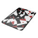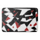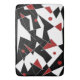 Várias formas geométricas brancas e vermelhas estão espalhadas sobre um fundo preto, criando um forte contraste. Algumas formas são interconectadas com linhas brancas finas, e pontos vermelhos adicionam um pop de cor à composição.
