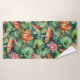 Uma bela toalha de banho com um padrão uniforme de koi, lírios de água e almofadas de lírios de água.