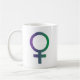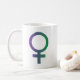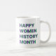 Uma caneca com o símbolo de Vênus e um "Feliz Mês da História das Mulheres", com as cores gradientes que representam dignidade, justiça, esperança e crescimento