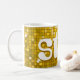 Mug com um padrão impresso estilizado, divertido e estilizado, de "azulejo espelhado disco" em tons de ouro e branco amarelos e texto retrô. Pode ser usado como um fundo para o seu próprio texto, imagens e ideias. Observe que esta é uma imagem de arte digital impressa, ela não brilha ou contém espelhos reais ou brilho.