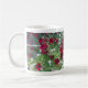 Esta caneca esportes uma fotografia de petúnias vermelhas profundas florescendo em sua beleza feroz.
