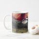 De Café Caneca com um Chickadee em uma cesta das maçãs