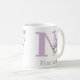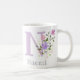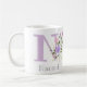 Delicioso desenho floral em cores pastéis com monograma e nome do destinatário. Inicial é a letra N. Caneca com uma decoração floral. O exemplo tem o nome Naomi.