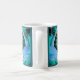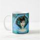 Esta caneca clássica é decorada com uma fada verde do estilo do déco da arte que vista uma borboleta elegante em sua cabeça.