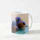Dois Bluebirds ocidentais que tomam um banho em um dia frio. Os pássaros limpos permanecem mornos.