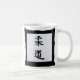 Caneca branca identificada por meio dos símbolos pretos do kanji que denotam o judo em um quadro oriental preto do estilo.