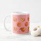 Caneca com design alegre do desenho do pêssego. Fundo cor-de-rosa. Esta caneca de café com os 17 desenhos originais diferentes do pêssego iluminará suas manhã e tarde. Faz um grande presente para o senhor mesmo ou outro para toda a ocasião.