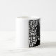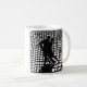 Caneca cerâmica branca que caracteriza a arte de Jon Ott, descrevendo um homem e uma mulher, mostrado em silhueta, dançando o tango em um trajeto do cobblestone. A arte original foi feita usando o linocut que printmaking.