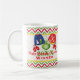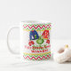 Seu partido festivo e da camisola feia do Natal ou do feriado do divertimento estará mais completo com esta caneca cerâmica personalizada como um prêmio para o vencedor da competição feia da camisola. As duas camisolas foleiros saltam fora do fundo vermelho, branco e verde do teste padrão listrado da viga com um ornamento verde de suspensão, de dois pares de mitenes, de um boneco de neve, do bastão de doces, da meia e das cabeças do papai noel. Apenas adicione o ano na caixa de texto fornecida ou personalize-o como você quer. Se você precisa alguma ajuda que personaliza esta caneca cómico para seu partido, envie por correio electrónico niteowlstudio@gmail.com.