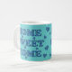 Uma caneca de café do estilo country com "casa doce Home" e corações no teste padrão da pervinca de Mix'n'Match de escalas diferentes em um fundo do Aqua que você possa facilmente mudar, se você deseja, usando o botão da personalização e então o botão da edição.
